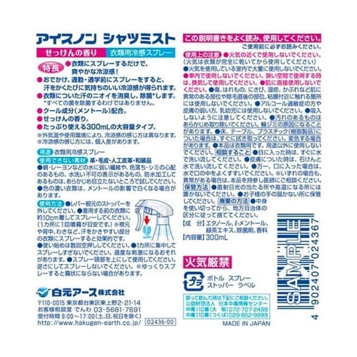 衣類にスプレーするだけで、爽やかな冷涼感!たっぷり使える300mLの大容量タイプ。おでかけ、通勤・通学前にスプレーをすると、汗をかくたびに強い冷涼感が得られます。 |