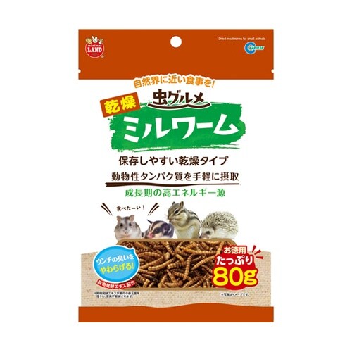 与えやすく、保存しやすい乾燥タイプのミルワーム。高タンパク、高脂肪でエネルギー補給にぴったり。便臭緩和成分配合。 |