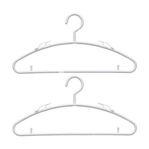 襟ぐりの広いカットソーもズレ落ちない、サイドクリップ付きのハンガーです。ショルダーフックが付いています。サイドクリップの位置は襟ぐりの大きさに応じて、最大43cmまでスライドします。 |