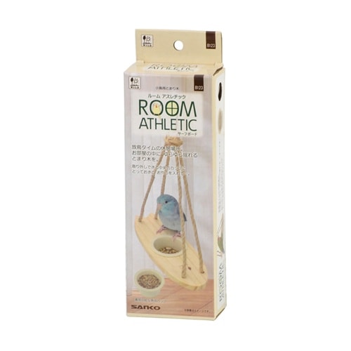 放鳥タイムの休憩場所。お部屋の中にゆらゆら揺れる止まり木を。取り外しが出来る中央のカップにとっておきのおやつを入れて・・・。サーフボードのような形。 |