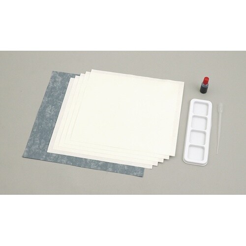 水墨画用墨液10ml×1、水墨画用紙梅(242×273mm)×5、簡易パレット200×50×10mm×1、スポイト×1、水墨画個人セット技法集A4サイズ×1、展示台紙×1