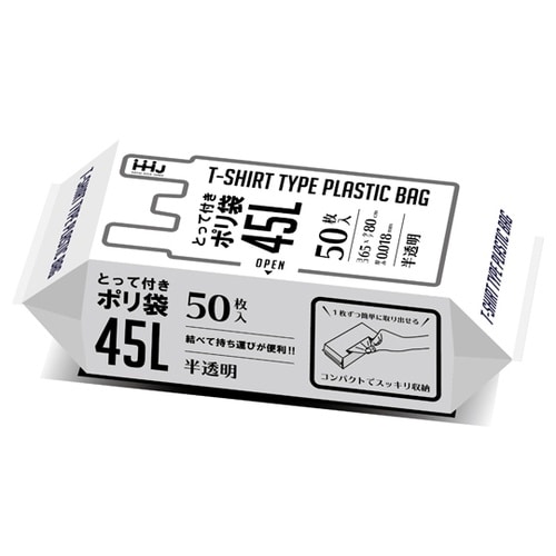 取っ手付き半透明のゴミ袋です。一枚あたり内容量は45Lです。レジ袋のように、カサカサした感触が特徴です。取っ手が付いているのでゴミ袋として使用した場合持ち運びが楽になります。 |