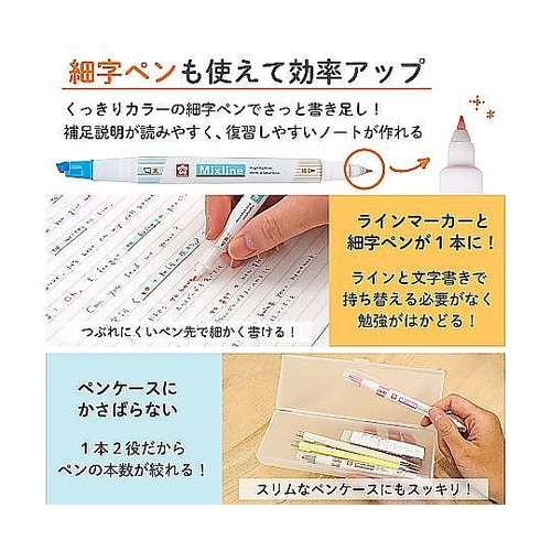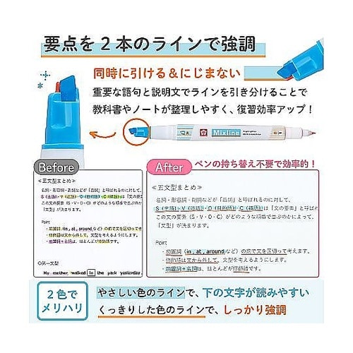 アンダーラインが同時にひけるラインマーカーです。重要な文字を簡単に目立たせることができます。文字書きもできるツインタイプです。 |