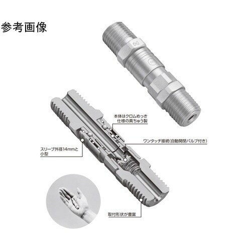 軽量・小型化を図ったワンタッチ接続タイプ。ソケットにバルブ機構を備えたスリーブ外径14mmのコンパクトタイプ。小型・モジュール化が進む分野に適しています。 |