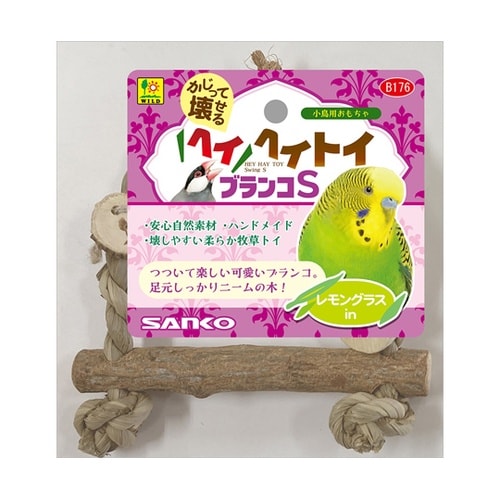 安心の自然素材のハンドメイド小鳥のおもちゃです。つついて楽しいかわいいブランコ!足元しっかりニームの木!壊しやすい柔らか牧草トイ。レモングラス入り。 |