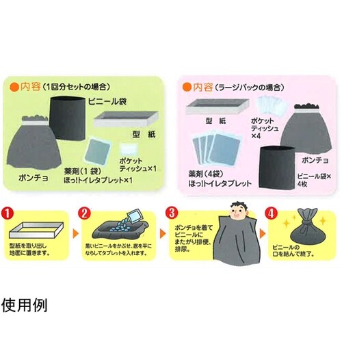 いざという時、持ってて安心!いつでもどこでもトイレが無くてもサッと広けて用を足せるので安心!!悪臭を無くして固めて、手間なく捨てられます。おう吐物のニオイも消えます。 |