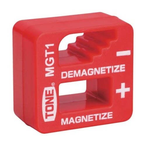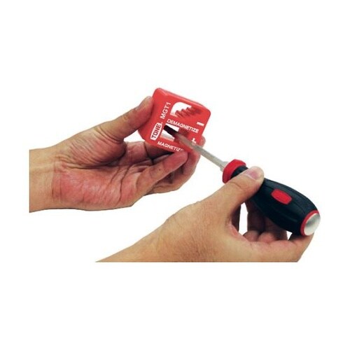 ドライバー、六角レンチなどの先端部を本体に差し込み、擦るだけで着磁・脱磁が可能です。+の部分で擦ると磁化、−の部分で擦ると磁力を取ることが可能です。工具の着脱磁に。 |