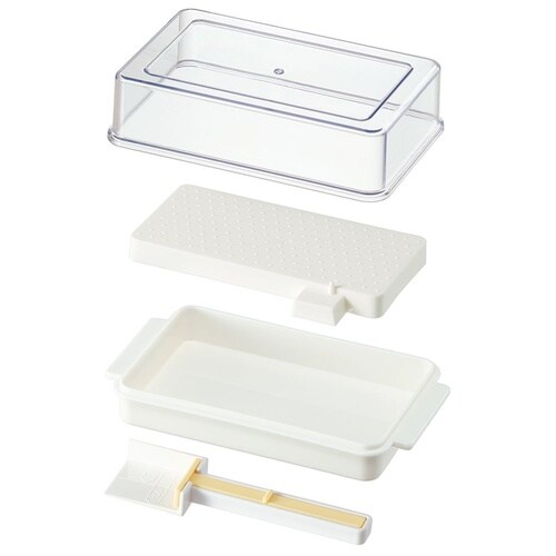 バターを計量する手間のいらない、バターカッター付きバターケース。市販の200gバターを約5g・約10gに切り出せるバターカッターが収納されています。バターカッターは専用スペースに清潔に収納。 |