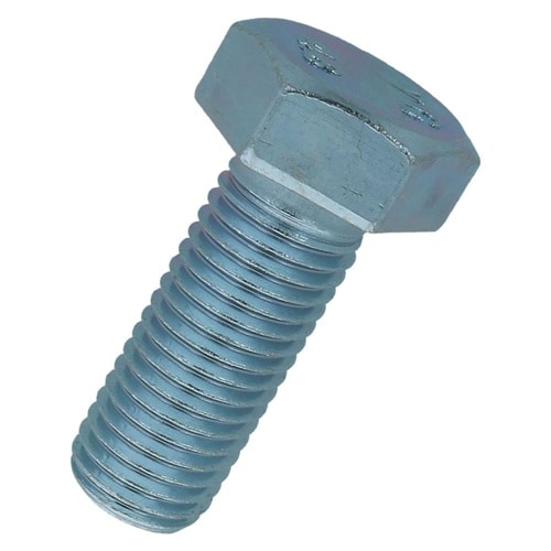 六角形状の頭部があり、胴の全体にねじが切ってあります。材質は鋼で耐食性向上のため、ユニクロめっき(薄青っぽい色合い)がしてあります。機械類の位置調整、締結用ねじです。生地に比べ耐食性があります。