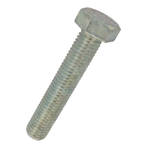 六角形状の頭部があり、胴の全体にねじが切ってあります。材質は鋼で耐食性向上のため、ユニクロめっき(薄青っぽい色合い)がしてあります。機械類の位置調整、締結用ねじです。生地に比べ耐食性があります。