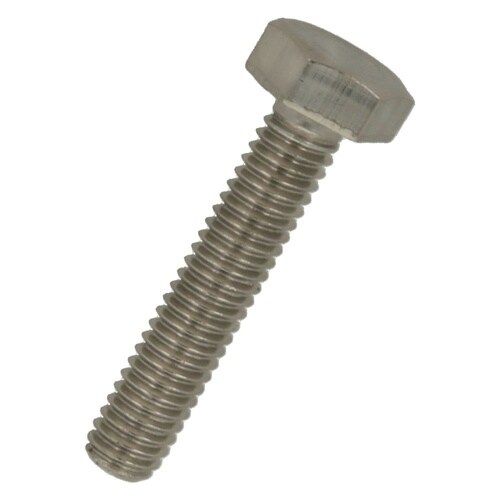 六角形状の頭部があり、胴の全体にねじが切ってあります。ステンレス鋼(SUS304系)なので耐食性、耐熱性に優れています。機械類の位置調整、締結用ねじです。