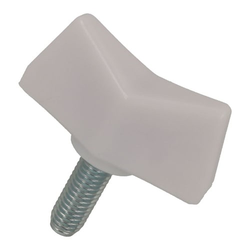 ねじ部の材質は鋼で耐食性向上のため、三価クロメートめっき(薄青っぽい色合い)がしてあります。樹脂部はナイロン6。手回しで締めつけが可能なねじです。つまみやすさを追求した形です。 |