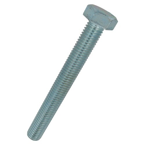 六角形状の頭部があり、胴の全体にねじが切ってあります。材質は鋼で耐食性向上のため、ユニクロめっき(薄青っぽい色合い)がしてあります。機械類の位置調整、締結用ねじです。生地に比べ耐食性があります。 |