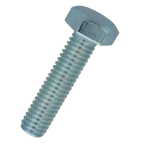 六角形状の頭部があり、胴の全体にねじが切ってあります。材質は鋼で耐食性向上のため、ユニクロめっき(薄青っぽい色合い)がしてあります。機械類の位置調整、締結用ねじです。生地に比べ耐食性があります。