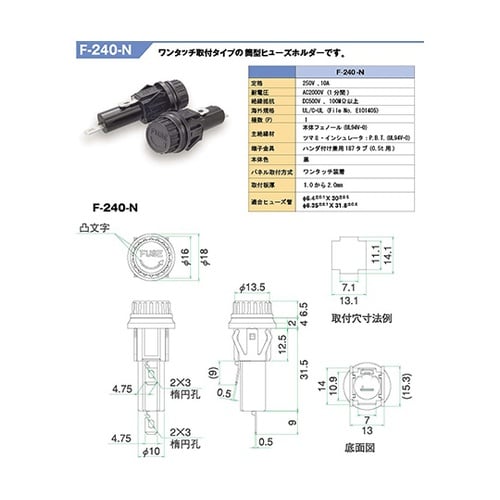 実装:パネル | 極数:1極 | 形状:筒型 | 操作部形状:丸 | 方式:ワンタッチ取付 | 定格:250V−10A | 端子金具:ハンダ付け兼用1…