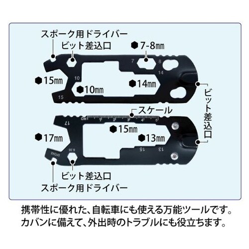 15のツールを搭載した自転車に使える携帯用万能ツール。自転車の修理、加工時に便利な携帯用ツール。カバンに備えて外出時のマシントラブルにも役立ちます。 |
