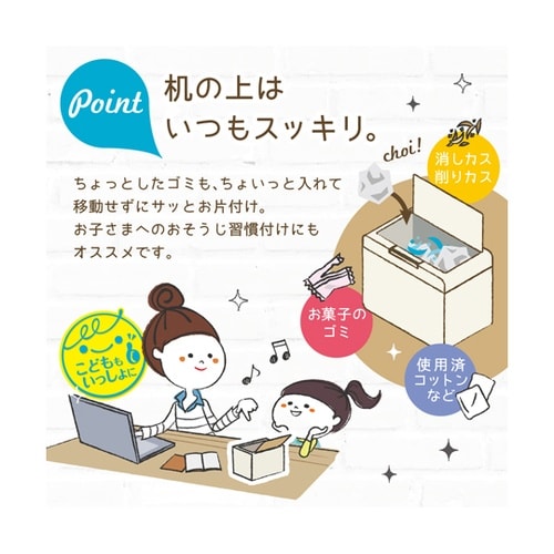 消しカス・削りカス、付箋、お菓子のゴミ、ティッシュなどのちょっとしたゴミもちょいっと入れてお片付け。木目のシンプルなデザインなのでリビングにも馴染みやすい。 |