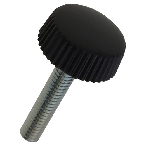樹脂製の頭部に金属製のねじが一体成型してあります。頭部の外周部にすべり止めのギザが付いてます。手で締付けたり緩めたりできます。工具を使わず手で繰り返しねじを脱着したい個所の締付けに使用します。 |