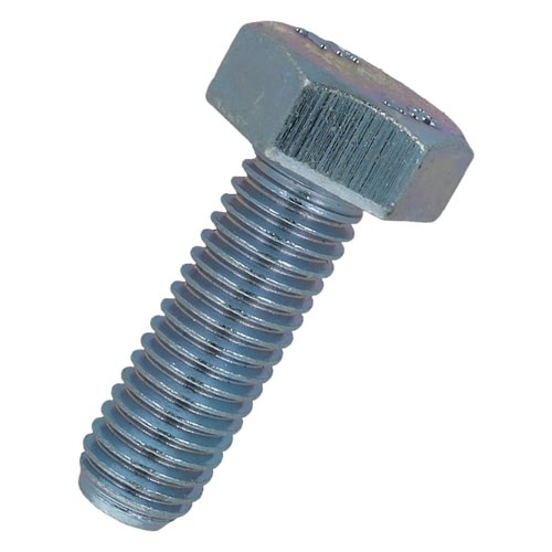 六角形状の頭部があり、胴の全体にねじが切ってあります。材質は鋼で耐食性向上のため、ユニクロめっき(薄青っぽい色合い)がしてあります。機械類の位置調整、締結用ねじです。生地に比べ耐食性があります。 |