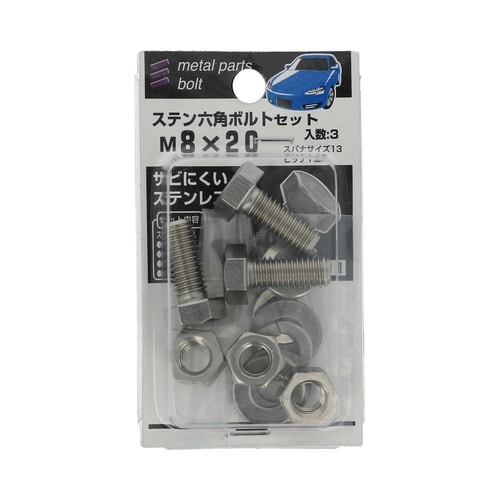 材質はステンレス(SUS304)で、サビにくい。ステン六角ボルト、ステン六角ナット、ステンワッシャー、ステンスプリングワッシャーのセットです。取付金具などの締結。 |
