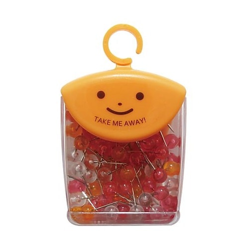 寸法:頭径・Φ6mm、針長・10mm | 材質:PS樹脂、鋼線 | 包装:フック付ケース(蓋・PP、容器・PS) | 色:クリアフルーツカラー3色アソ…