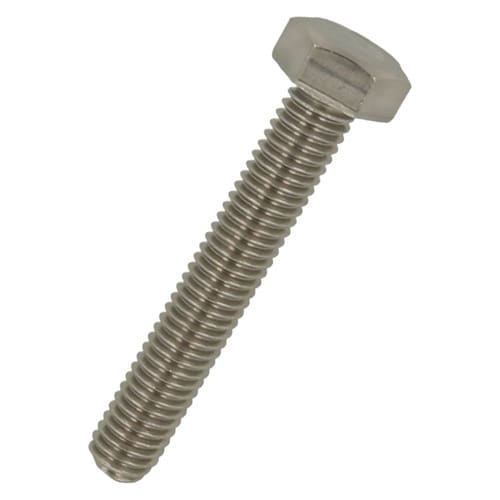 六角形状の頭部があり、胴の全体にねじが切ってあります。ステンレス鋼(SUS304系)なので耐食性、耐熱性に優れています。機械類の位置調整、締結用ねじです。