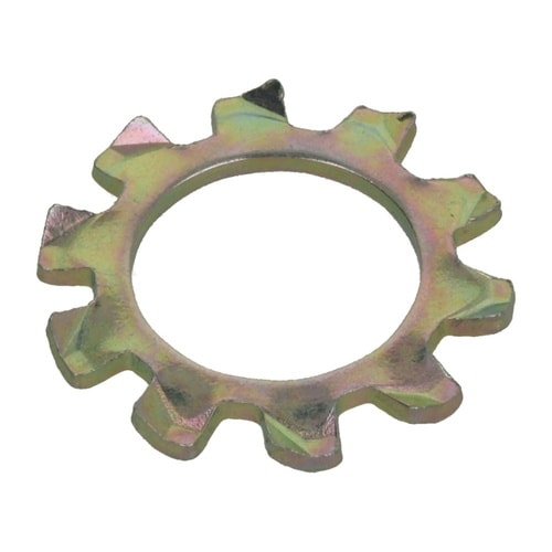 外形の歯の先は焼きが入っています。歯が相手部材に食込むため、ゆるみにくくなります。材質は鋼で耐食性向上のため、三価クロメートめっき(薄青っぽい色合い)がしてあります。