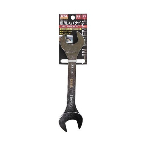 狭い隙間でのボルト締め緩め作業に最適。厚さ約3mmでキャスターなどのボルト回しや、通常のスパナの入らない箇所に便利です。落下防止穴付。焼入加工済。 |