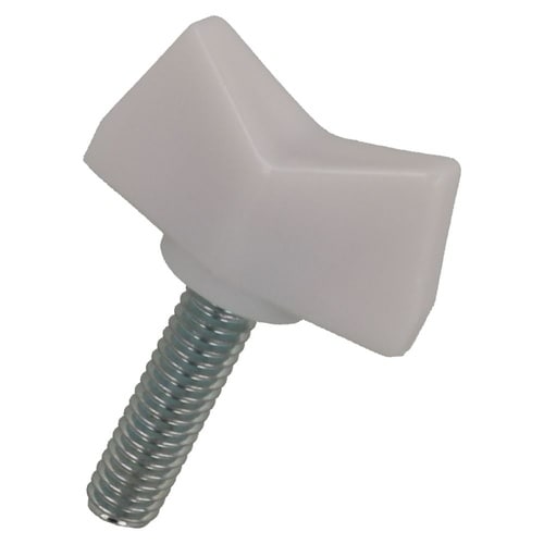 ねじ部の材質は鋼で耐食性向上のため、三価クロメートめっき(薄青っぽい色合い)がしてあります。樹脂部はナイロン6。手回しで締めつけが可能なねじです。つまみやすさを追求した形です。