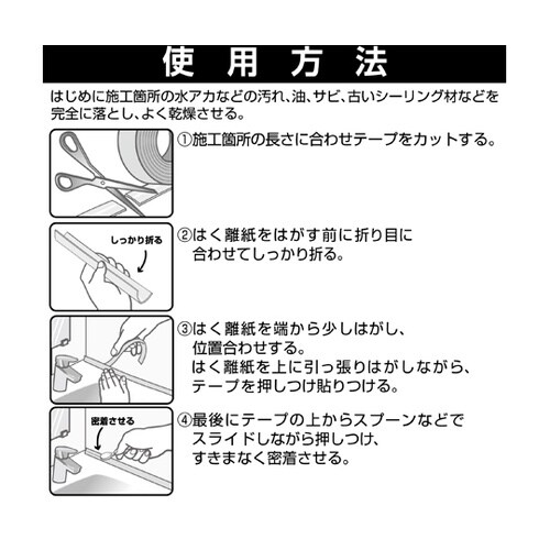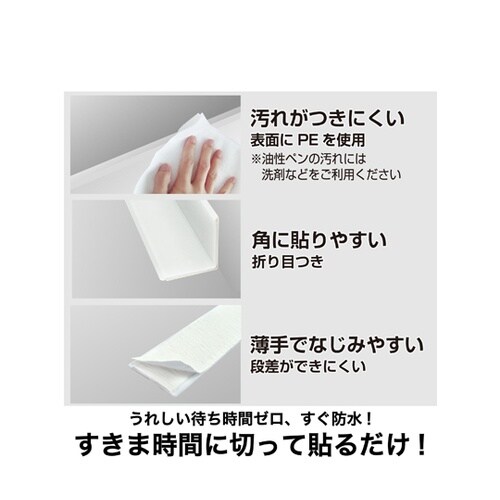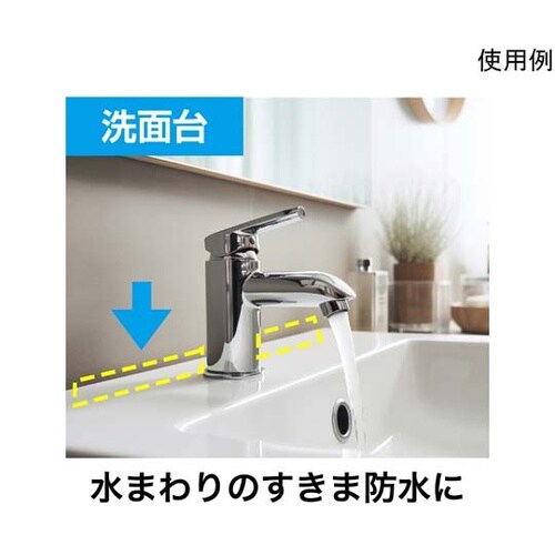 浴室やキッチン、洗面所など水まわりにご使用いただける防水テープです。使用後すぐに防水効果を得られるため、すきま時間に切って貼るだけで防水対策いただけます。 |
