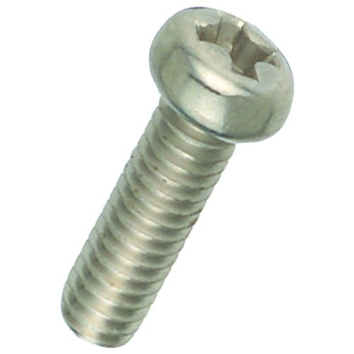十字穴付きのなべ頭小ねじです。頭部が出ても差し支えない所に使われます。材質は鋼で耐食性向上のため、ニッケルめっき(白っぽい色合い)がしてあります。ボルトに比べ小さな部材の一般的な締結に使用します。 |