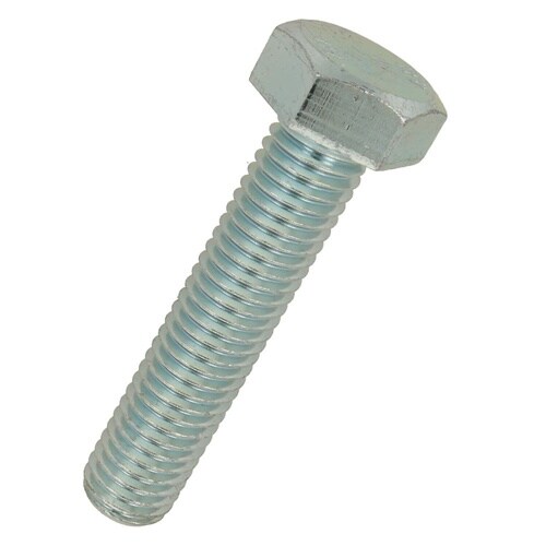 六角形状の頭部があり、胴の全体にねじが切ってあります。材質は鋼で耐食性向上のため、ユニクロめっき(薄青っぽい色合い)がしてあります。機械類の位置調整、締結用ねじです。生地に比べ耐食性があります。