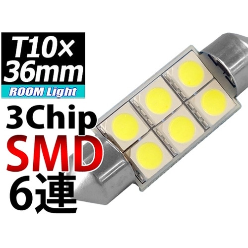 T10×36mmLEDバルブ 3chipSMD×6。3chipSMD採用で驚きの明るさ!!LED6発ですが、3chipSMD[5050タイプ]ですので、18発分の明るさです。 |