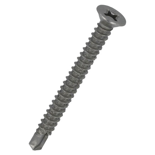 十字穴付きの皿頭タッピンねじで先端が切り刃になっています。切り刃で下穴をあけ連動してタップ立て、締付けまでがドリルねじ1本で出来ます。熱処理が必要ですのでSUS410を使用しています。 |