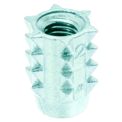 外周のノコ歯型鬼目突起が木部に食込むので戻りにくく、ゆるみの心配も不要です。先端に打込みガイドのテーパが付いているので、挿入作業が容易にできます。 |