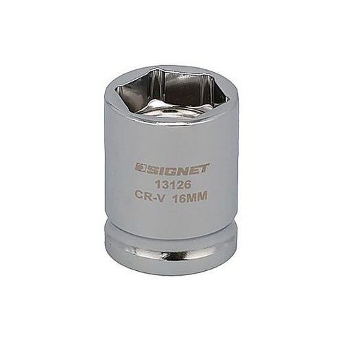 ミラー仕上げのメッキが美しいショートソケット。6角タイプ。ソケットの全長はわずか28mm(SIGNET従来品より15mm短い)、狭い場所での作業に最適。吊り下げタグ付き。 |