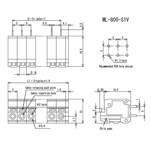 定格:250V−10A | 極数:3極 | 端子間ピッチ:5mm | 端子金具:PC端子 | 推奨適合工具:マイナスドライバー(軸径φ3mm、刃先巾2…