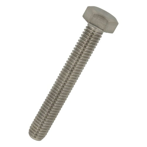六角形状の頭部があり、胴の全体にねじが切ってあります。ステンレス鋼(SUS304系)なので耐食性、耐熱性に優れています。機械類の位置調整、締結用ねじです。