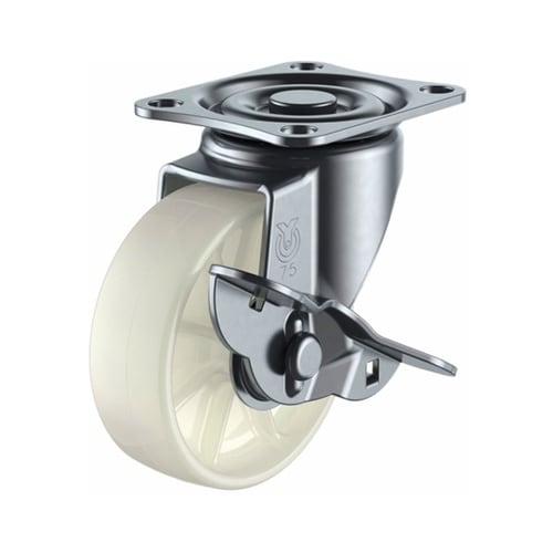 軽荷重向け(ライトスター)小回り、軽快、手軽さ。使いやすさにこだわったコンパクトモデル。自在車。旋回部と車輪が回転するキャスターです。プレート式。 |