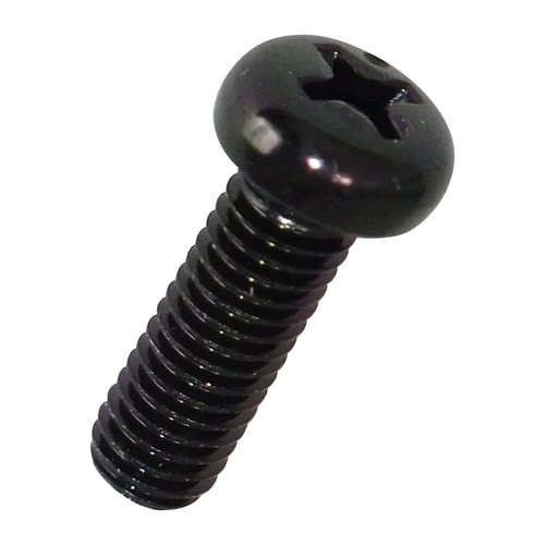 十字穴付きのなべ頭小ねじです。頭部が出ても差し支えない所に使われます。材質は鋼で耐食性向上のため、黒色亜鉛クロメートめっき(黒っぽい色合い)がしてあります。 |