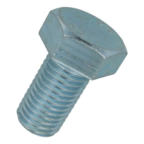 六角形状の頭部があり、胴の全体にねじが切ってあります。材質は鋼で耐食性向上のため、ユニクロめっき(薄青っぽい色合い)がしてあります。機械類の位置調整、締結用ねじです。生地に比べ耐食性があります。