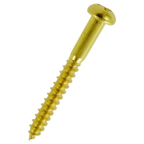 十字穴付きの丸頭ねじで、木材専用です。打ち込む時に木材などにできる破損を防ぐために、ピッチが粗くなっています。黄銅なので金属光沢が美しく、耐食性に優れています。木材に使用します。 |