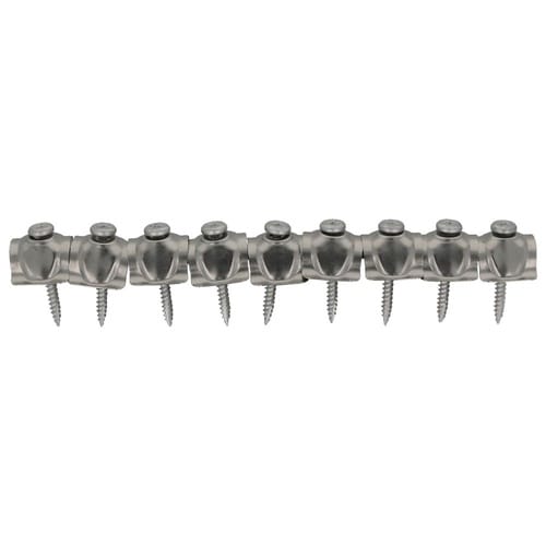 高所作業や持ち運びに便利な9連結で作業性に優れています。先端カットで下穴が不要、電動ドライバーでの施工が可能です。下地が木の場合、ガルバ波板の取り付けに使用します。 |
