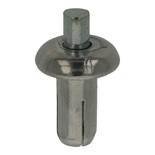 材質はアルミニウム、鉄(ピン部)です。先端に割れのあるリベットに頭から差し込まれたピンをハンマーで叩くと先端が広がり締結します。建造物や板金、家具、フェンスなどに使用します。 |