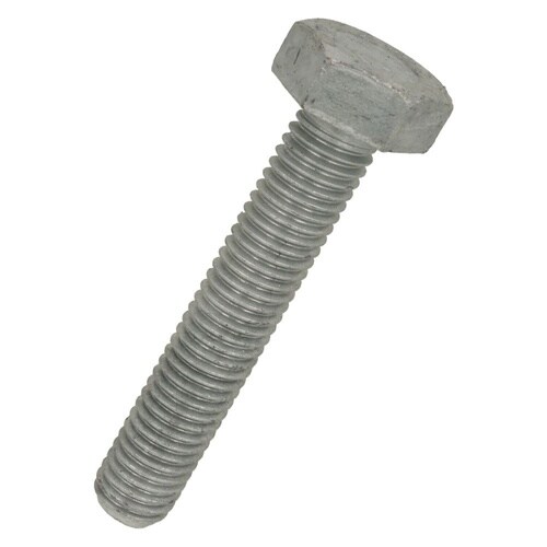 六角形状の頭部があり、胴の全体にねじが切ってあります。材質は鋼で耐食性向上のため、溶融亜鉛めっき(白っぽい色合い)がしてあります。機械、構造物等の一般的な締付け又は、調整に使用します。 |