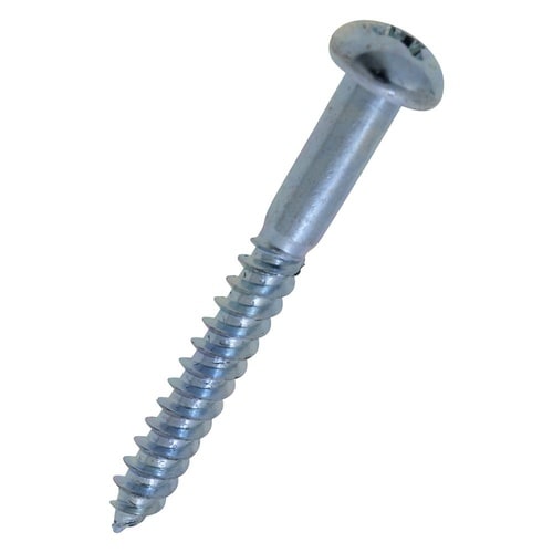 材質は鉄でユニクロめっき。十字穴付きの丸頭ねじで、木材専用です。打ち込む時に木材などにできる破損を防ぐために、ピッチが粗くなっています。木材に使用します。硬い木材には下穴が必要です。 |