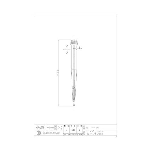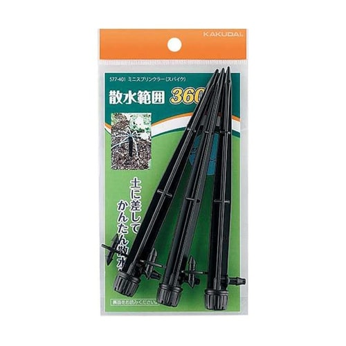 土に差してかんたん散水。上部をまわして流量調節ができます。地面に突刺し、5780マカロニホースで給水し散水します。散水角度360°。 |