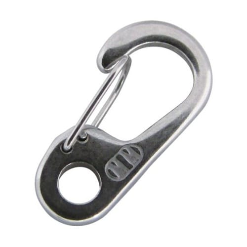 フック部とチェーン・ロープを入れる部分が分かれています。SUS316で、耐食性に優れます。産業機械関連、工具などの脱落防止用の補助金具として。