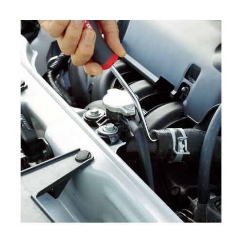ホースのピックアップに便利な曲り形状です。エンジンルーム内のラジエーターアッパーホースの脱着に。エンジンルーム冷却系統のラバーホース脱着作業に。 |