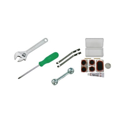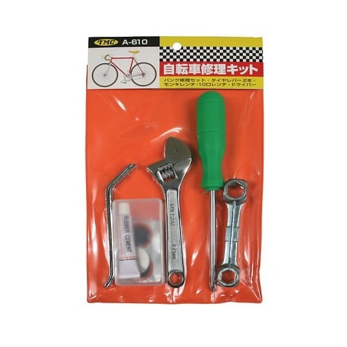 自転車の修理、点検に必要な道具を専用収納袋にセットしました。モンキーレンチ150mm/+2ドライバー/ボーンレンチ/タイヤレバー×2本/パンク修理セット。 |